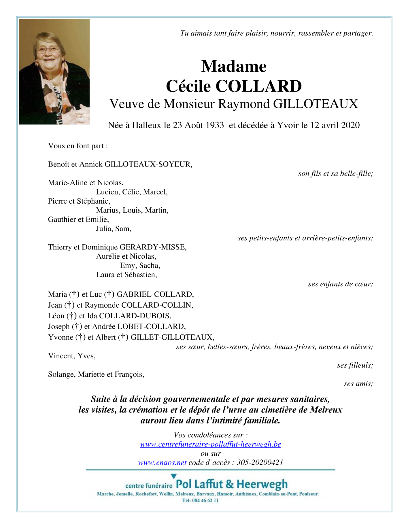 Décédée à Yvoir (5530) le dimanche 12 avril 2020 à l'âge de 86 ans