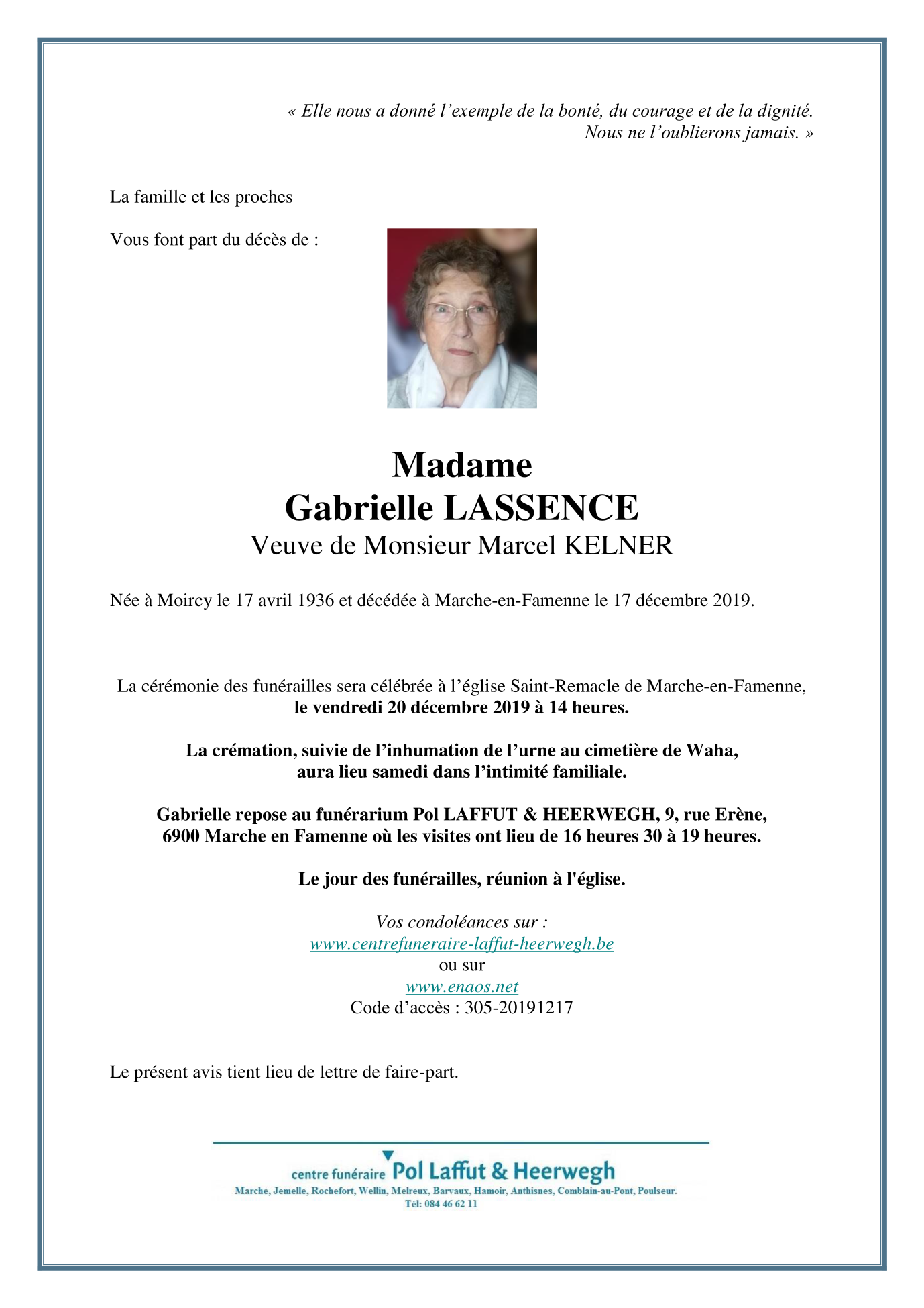 Décédée à Marche-en-Famenne (6900) le mardi 17 décembre 2019 à l'âge de 83 ans