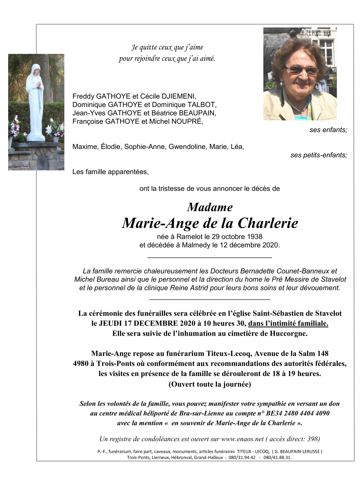 Overleden te Malmedy (4960) op zaterdag 12 december 2020 op 82-jarige leeftijd