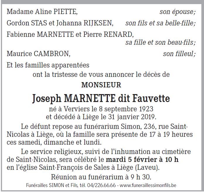 Décédé à Liège (4000) le jeudi 31 janvier 2019 à l'âge de 95 ans