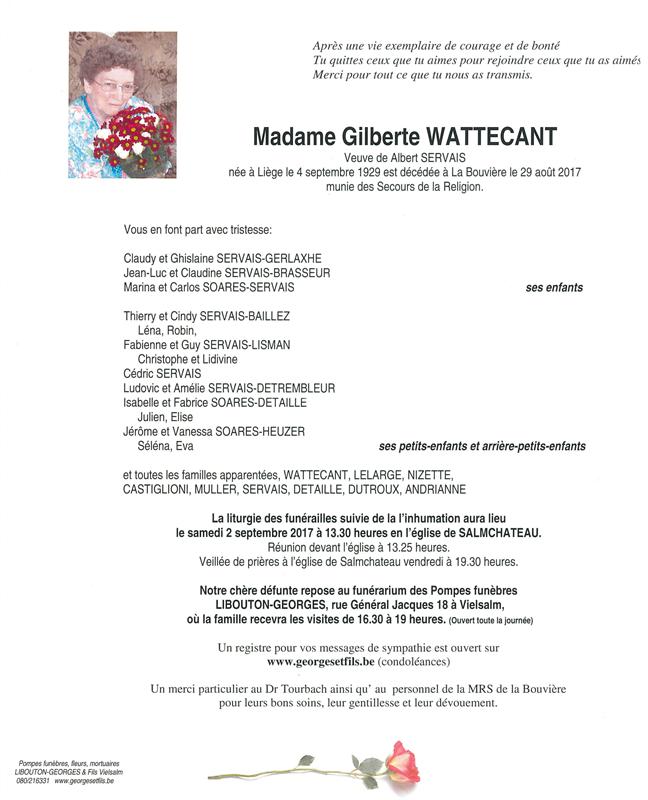 Madame Gilberte WATTECANT veuve d'Albert SERVAIS