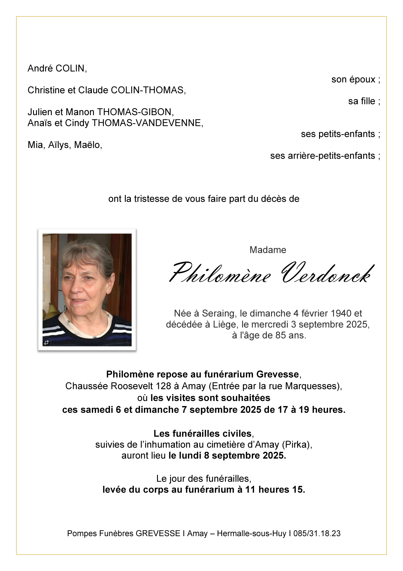 Décédée à Liège (4000) le mercredi 3 septembre 2025 à l'âge de 85 ans