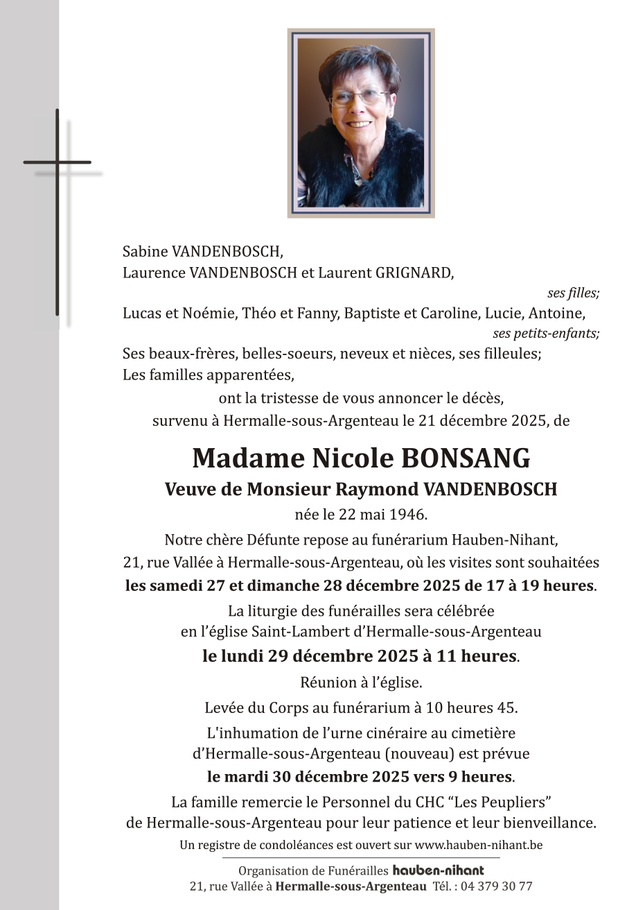Died in Hermalle-sous-Argenteau (4681) on 21 December 2025 at the age of 79 years