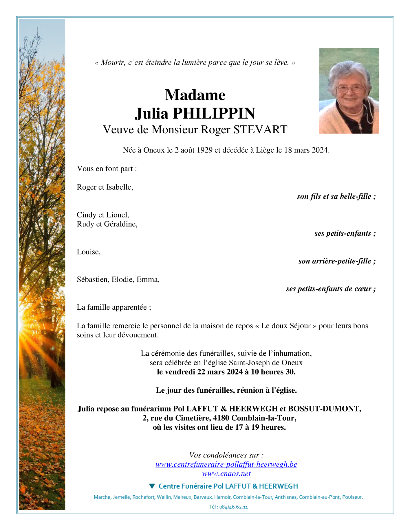 Née à Oneux (4170) le vendredi 2 août 1929