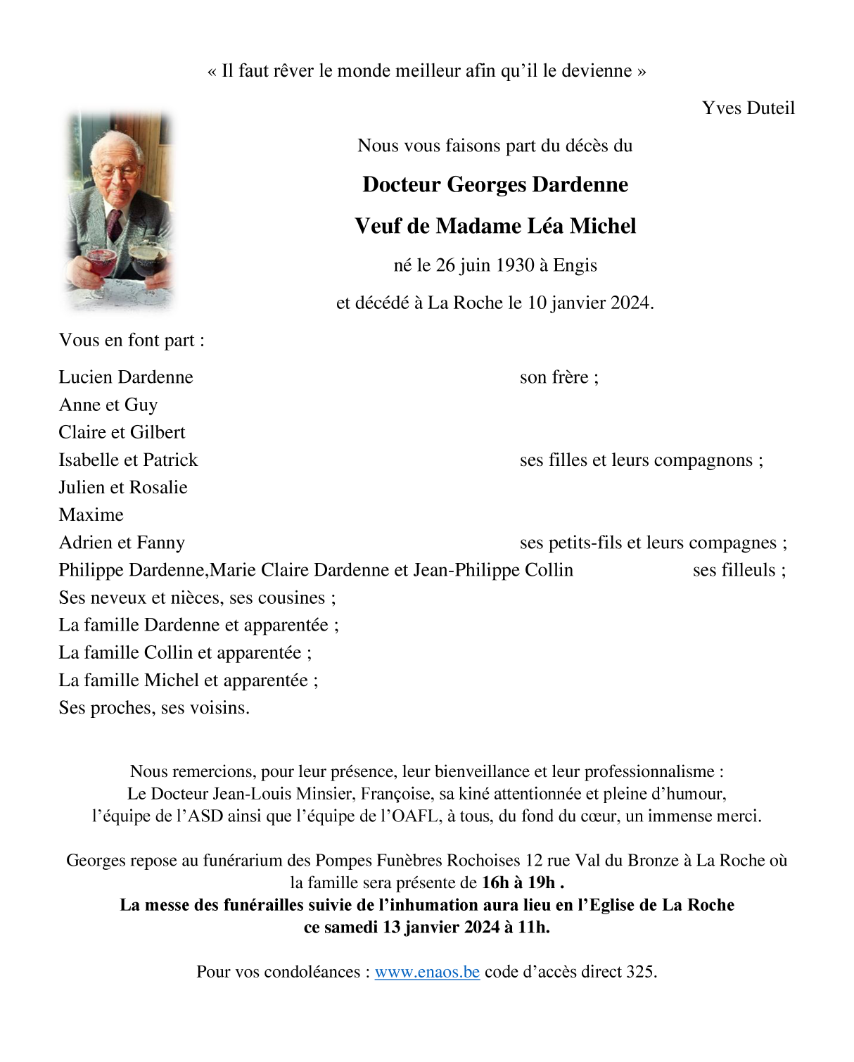 Décédé à La Roche-en-Ardenne (6980) le mercredi 10 janvier 2024 à l'âge de 93 ans
