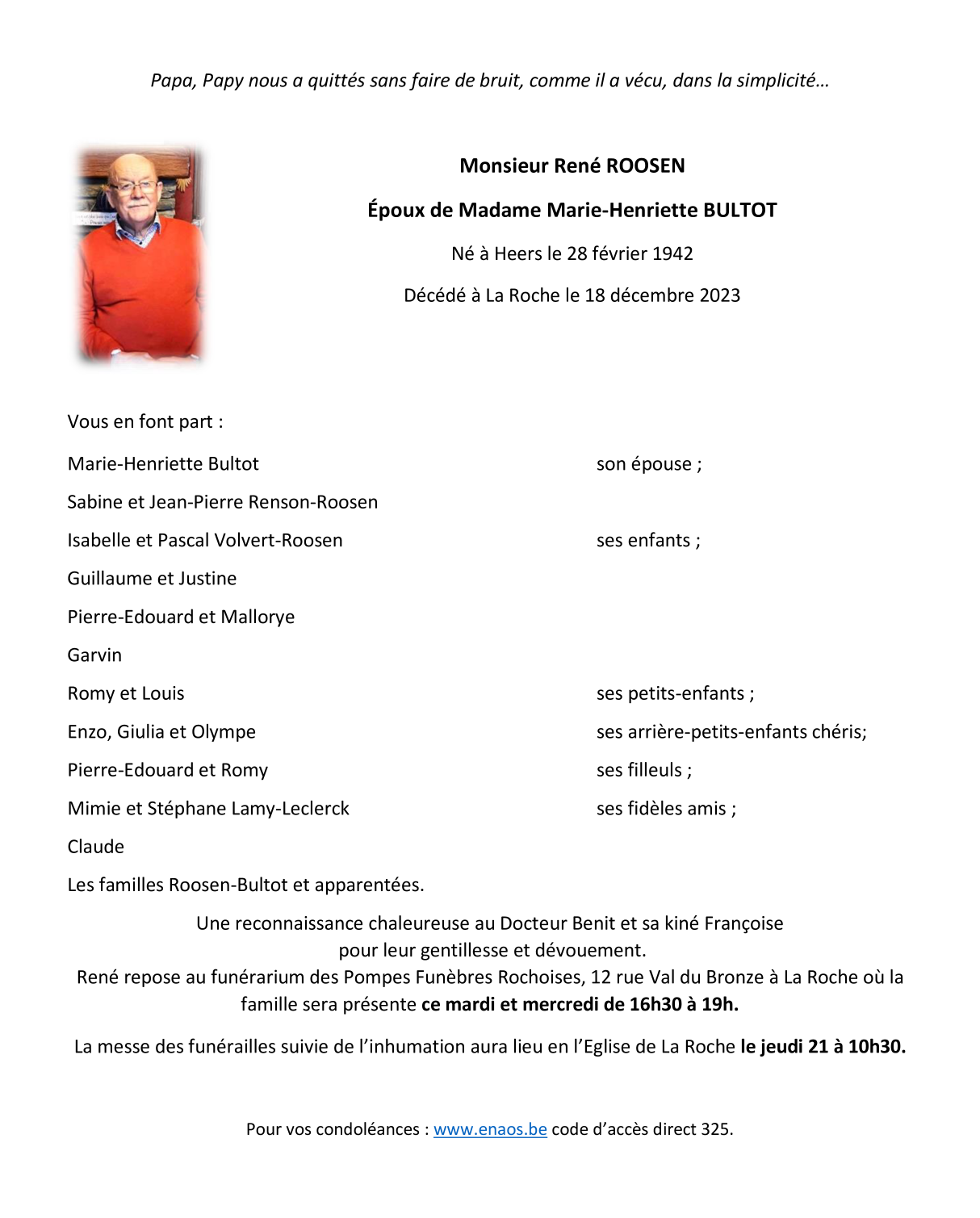 Décédé à La Roche-en-Ardenne (6980) le lundi 18 décembre 2023 à l'âge de 81 ans