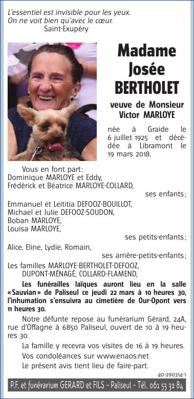 Died in Libramont (6800) on 19 March 2018 at the age of 92 years