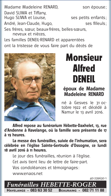 Fallecido en Namur (5000) el miércoles, 13 de abril de 2016 a la edad de 93 años