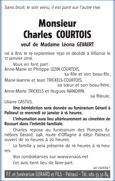 Décédé à Villance (6890) le dimanche 17 janvier 2016 à l'âge de 85 ans