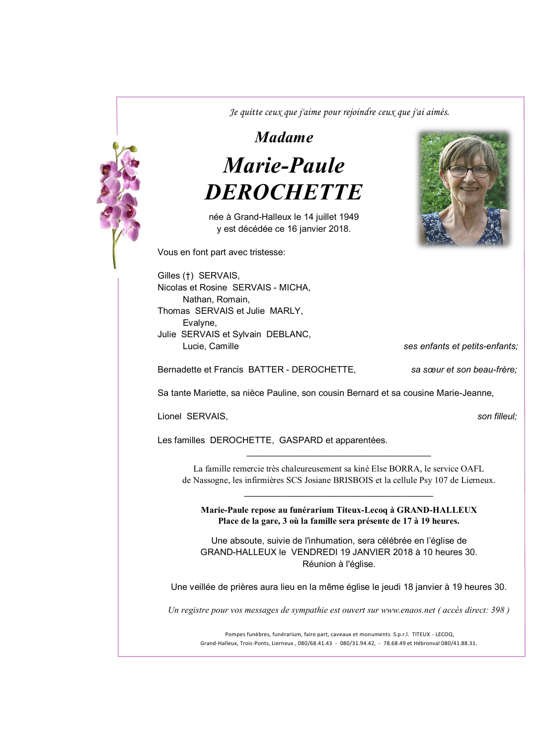 Décédée à Grand-Halleux (6698) le mardi 16 janvier 2018 à l'âge de 68 ans