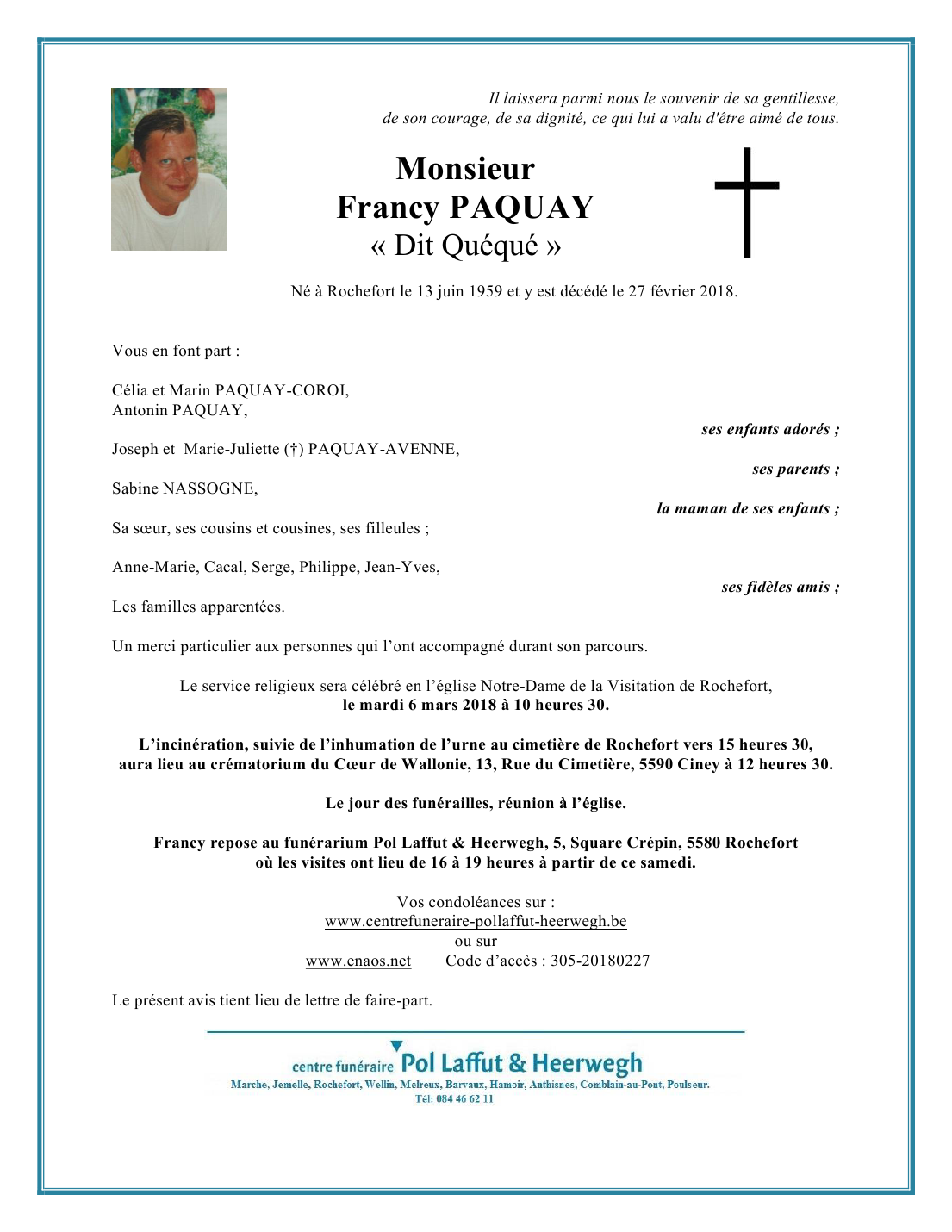 Décédé à Rochefort (5580) le mardi 27 février 2018 à l'âge de 58 ans