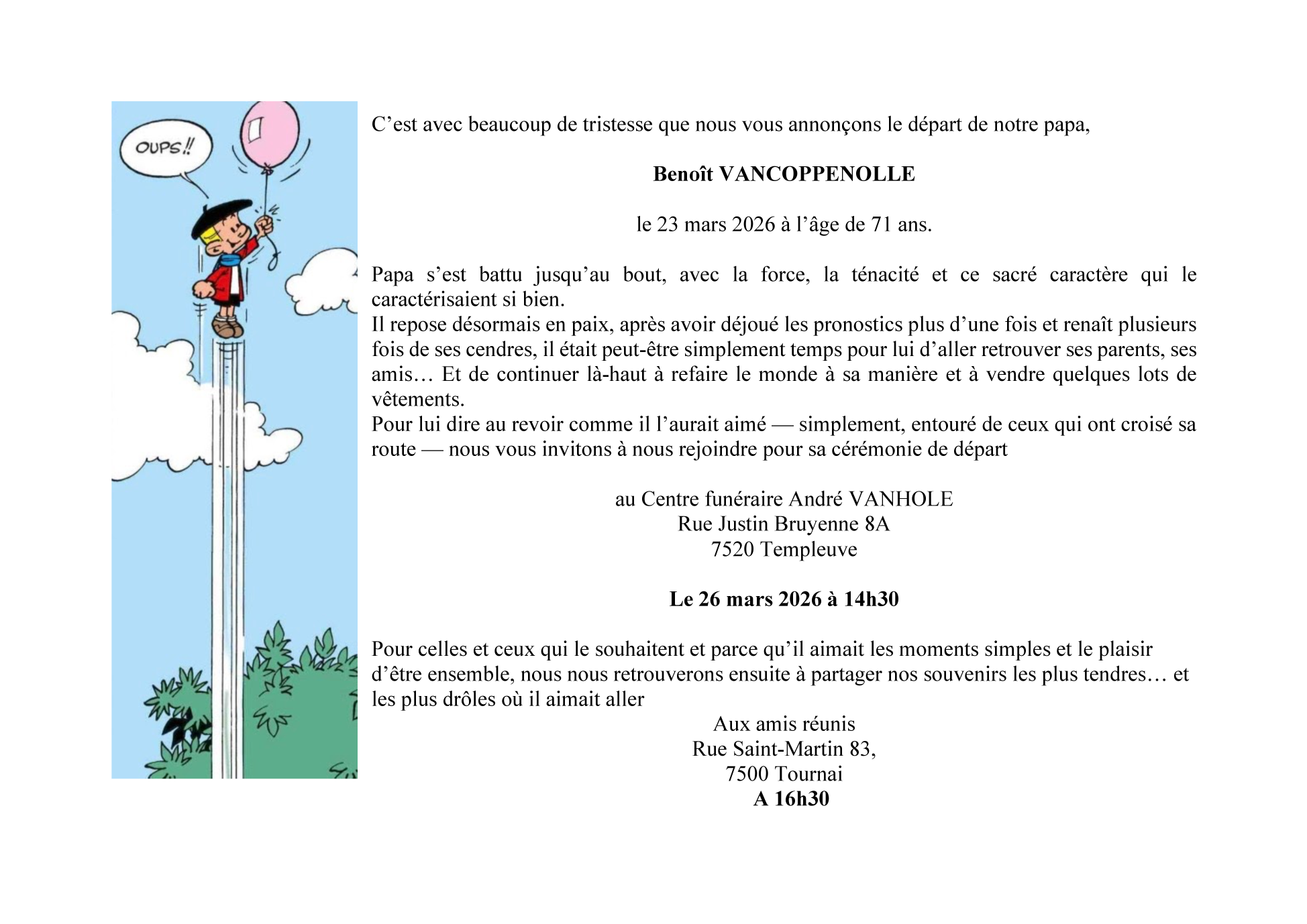 Décédé à Tournai (7500) le lundi 23 mars 2026 à l'âge de 71 ans