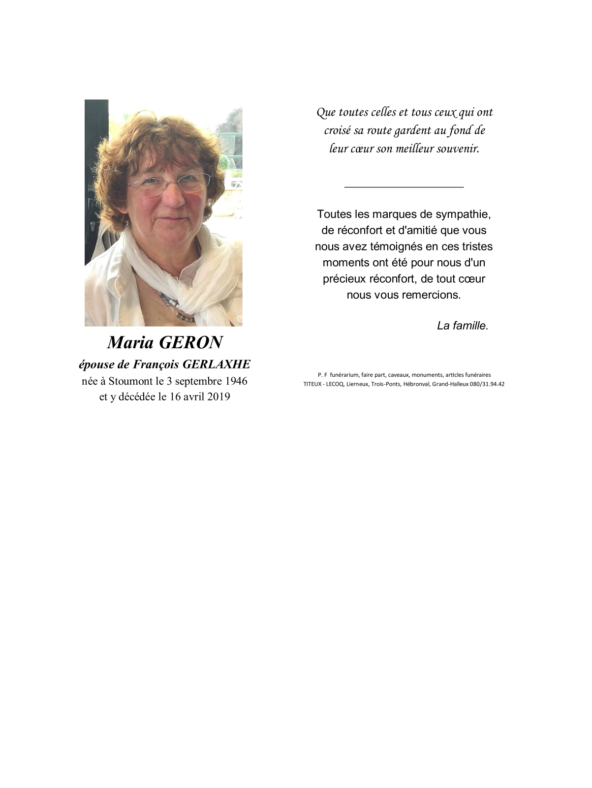 Décédée à Stoumont (4987) le mardi 16 avril 2019 à l'âge de 72 ans