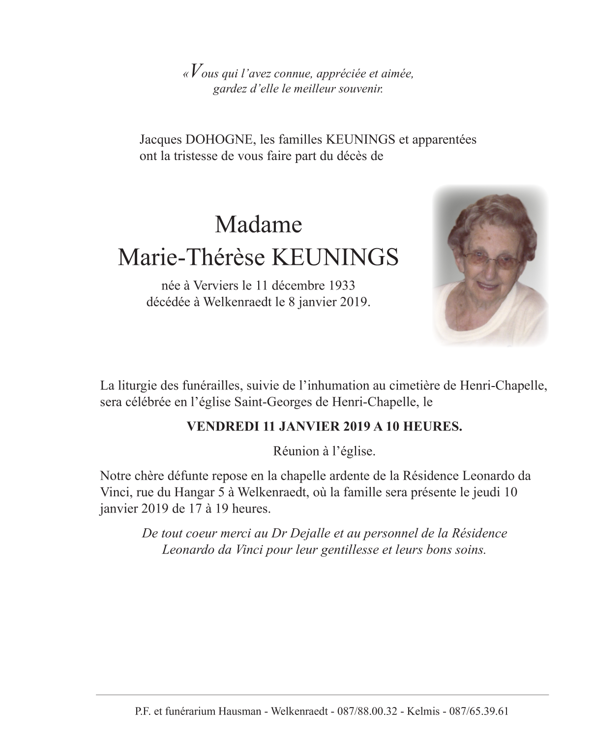 Décédée à Welkenraedt (4840) le mardi 8 janvier 2019 à l'âge de 85 ans