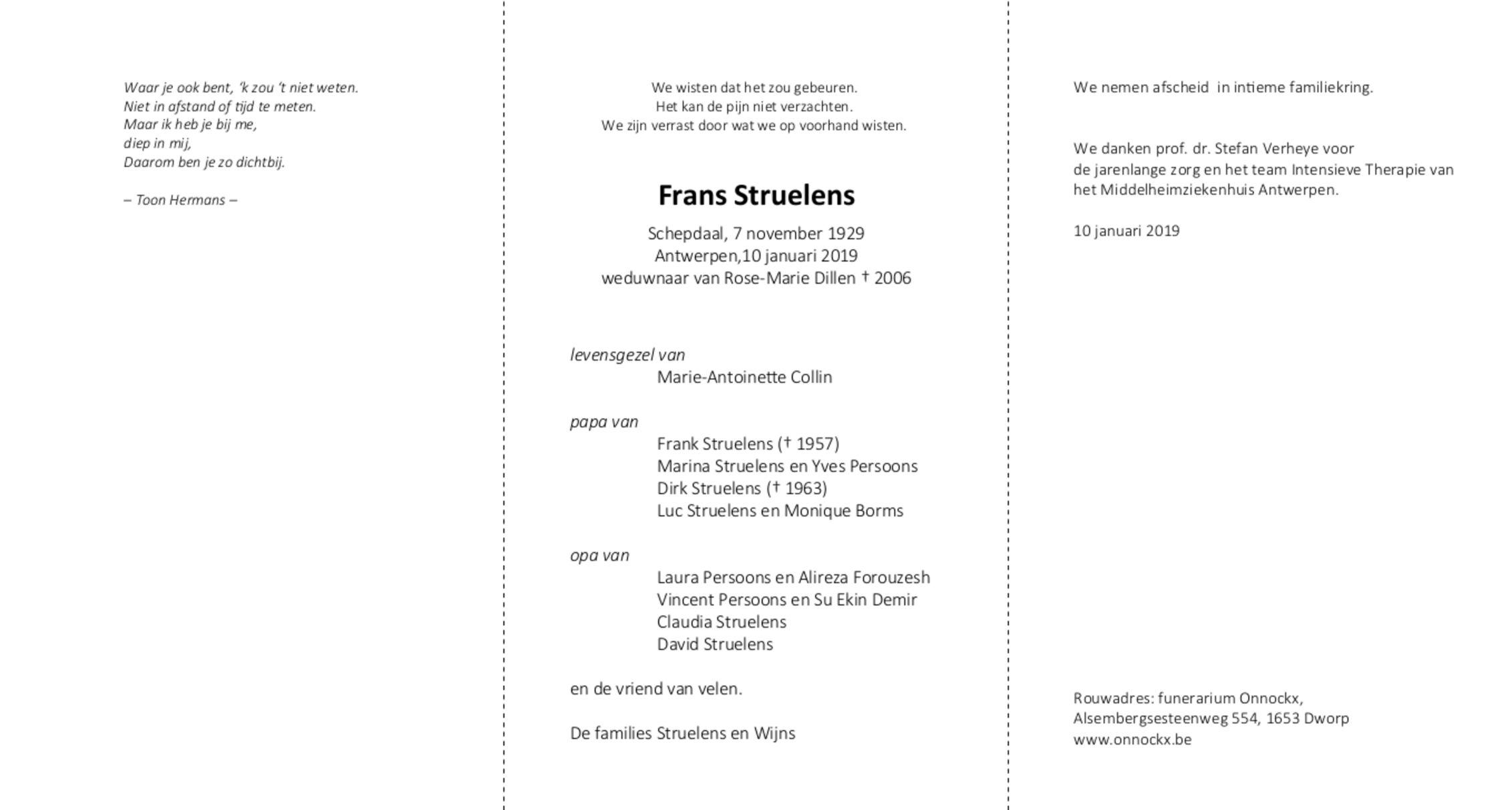Fallecido en Antwerpen (2020) el jueves, 10 de enero de 2019 a la edad de 89 años
