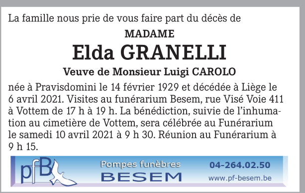 Décédée à Liège (4000) le mardi 6 avril 2021 à l'âge de 92 ans