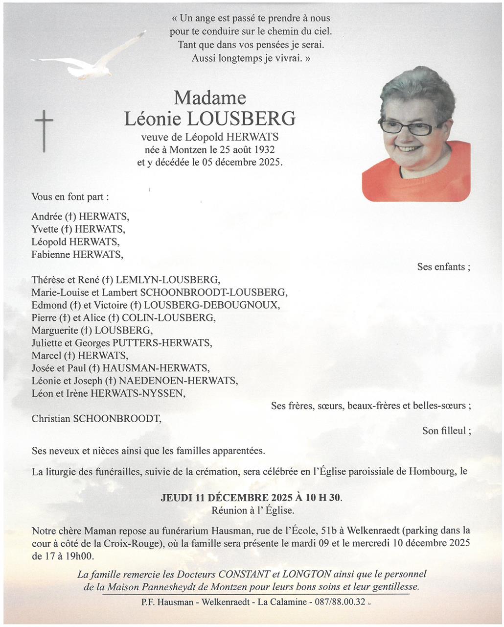 Décédée à Montzen (4850) le vendredi 5 décembre 2025 à l'âge de 93 ans