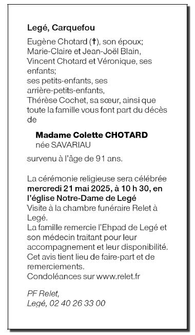 Décédée à Legé (44650, France) le vendredi 16 mai 2025 à l'âge de 91 ans