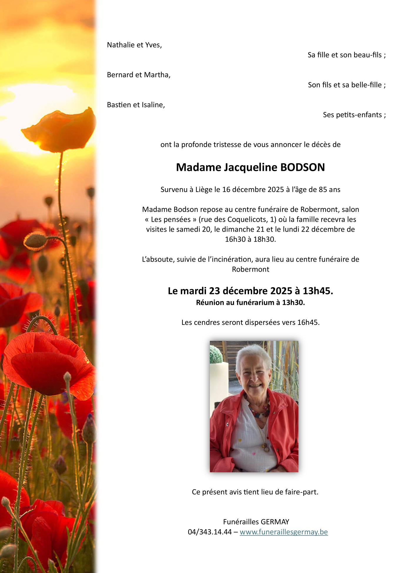 Décédée à Chênée (4032) le mardi 16 décembre 2025 à l'âge de 85 ans