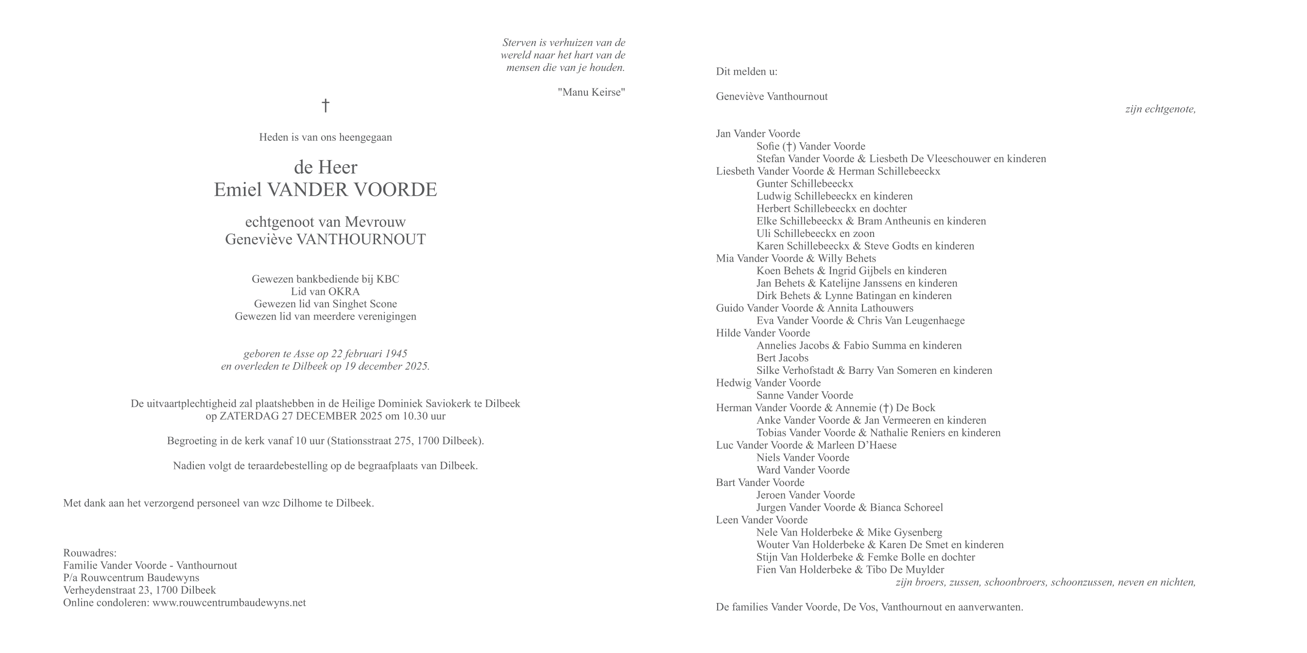 Décédé à Dilbeek (1700) le vendredi 19 décembre 2025 à l'âge de 80 ans