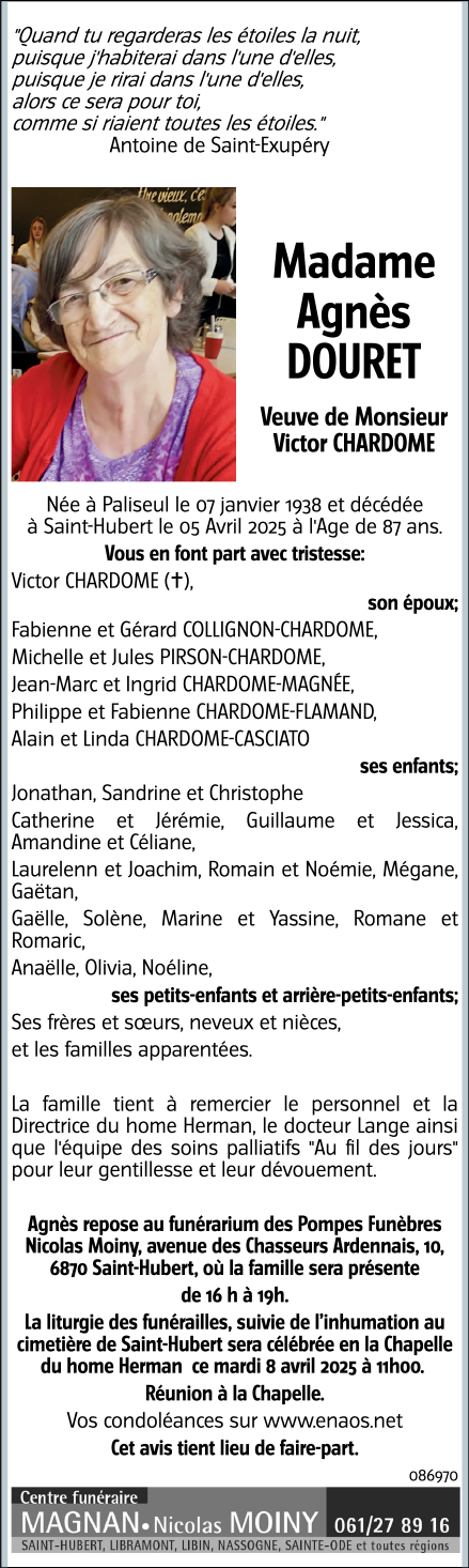 Décédée à Saint-Hubert (6870) le samedi 5 avril 2025 à l'âge de 87 ans