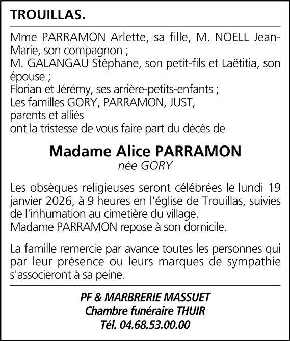 Décédée à Trouillas (66300, France) le vendredi 16 janvier 2026 à l'âge de 92 ans