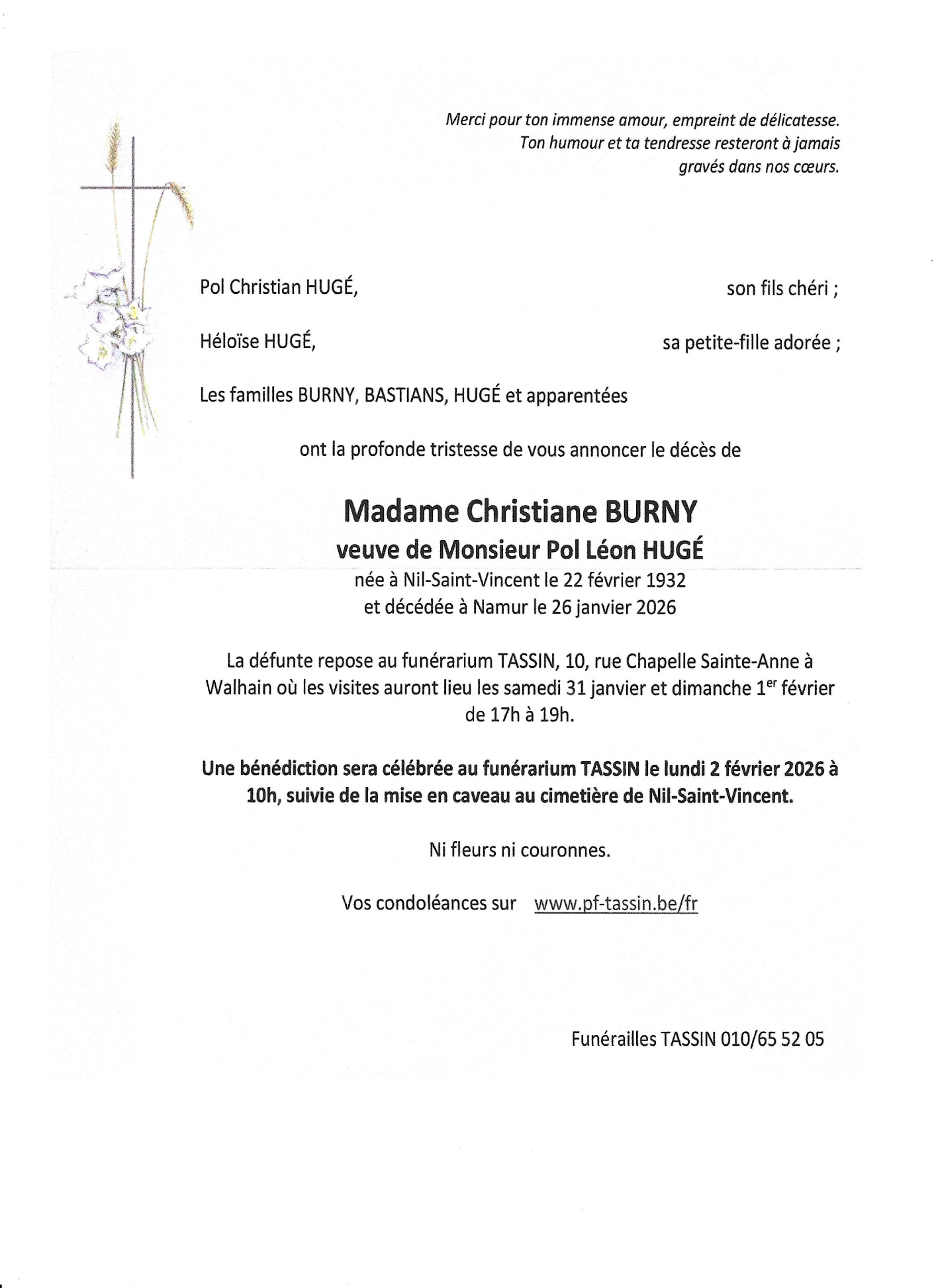 Décédée à Namur (5000) le lundi 26 janvier 2026 à l'âge de 93 ans