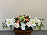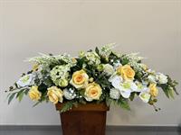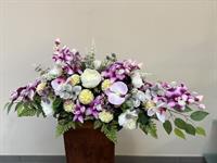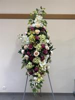 Imposante et élégante composition réalisée en fleurs artificielles haut de gamme, conçue pour rendre un hommage solennel et raffiné. Ce montage associe de sublimes orchidées, des roses, des hortensias tendre et des fleurs texturées, harmonieusement intégrés à un feuillage naturel retombant.