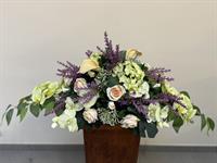 Élégant arrangement en fleurs en soie de haute qualité, mêlant la douceur des roses, l’éclat des orchidées, et la fraîcheur de la lavande. Quelques callas et hortensias complètent harmonieusement cette composition, sublimée par un feuillage naturel.