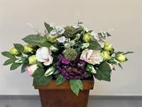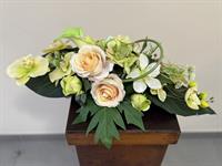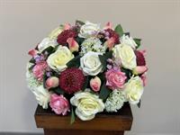 Composition élégante et généreuse en fleurs artificielles haut de gamme, associant de sublimes roses, des roses poudré, et de délicates fleurs décoratives, rehaussées par de belles fleurs texturées. Le feuillage vert profond apporte contraste et équilibre à l’ensemble.