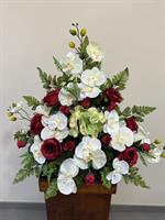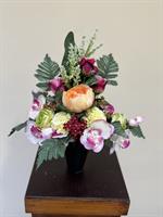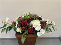 Composition élégante et expressive en fleurs artificielles haut de gamme, associant de profondes roses, symboles d’amour et de respect, à de délicates orchidées et des fleurs. Le tout est harmonieusement complété par un feuillage vert structuré pour un rendu naturel et équilibré.