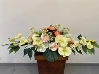 Composition lumineuse et harmonieuse en fleurs artificielles haut de gamme, associant de délicates orchidées, des roses et de fines fleurs décoratives. L’ensemble est sublimé par un feuillage vert travaillé, apportant équilibre et naturel à la création.