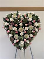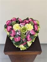 Magnifique composition en forme de cœur, réalisée en fleurs artificielles haut de gamme, symbole d’amour éternel et de souvenir profond. Ce montage associe de délicates roses, des boutons de roses, et de jolies fleurs texturées vert doux, harmonieusement réparties sur un feuillage dense et naturel.