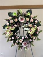 Élégante couronne réalisée en fleurs artificielles haut de gamme, symbole d’hommage et de souvenir éternel. Cette composition associe de délicates roses, des orchidées, de jolis gerberas et des callas, harmonieusement disposés sur un feuillage dense et naturel.