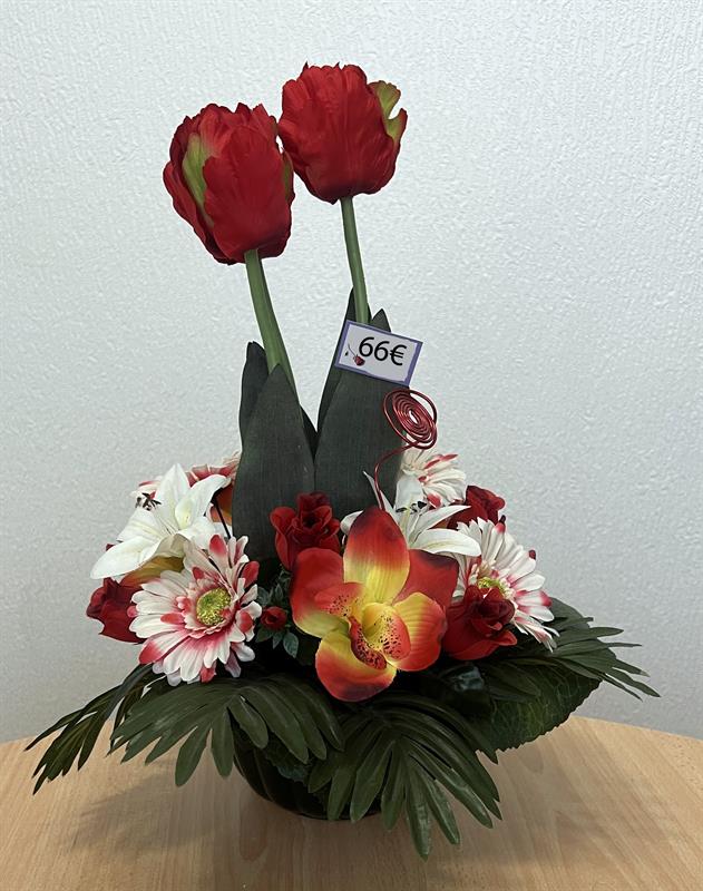 | Composition de fleurs tergal Composition de fleurs tergal dans un pot lesté avec des roses, orchidées, bambous.