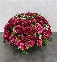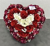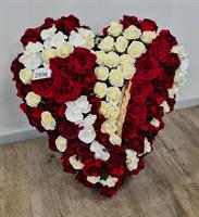 | Cœur de roses Composition en forme de cœur avec des fleurs tergal dans pot bien lesté. Roses rouges, blanches et bordeaux, gypsophile.
