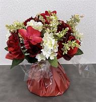 | Composition de fleurs tergal Composition de fleurs tergal dans un pot lesté avec des roses rouges et roses.