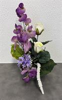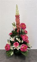 | Composition de fleurs tergal Composition de fleurs tergal dans un pot lesté avec des roses, œillets et branches d'orchidées.