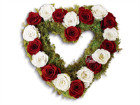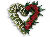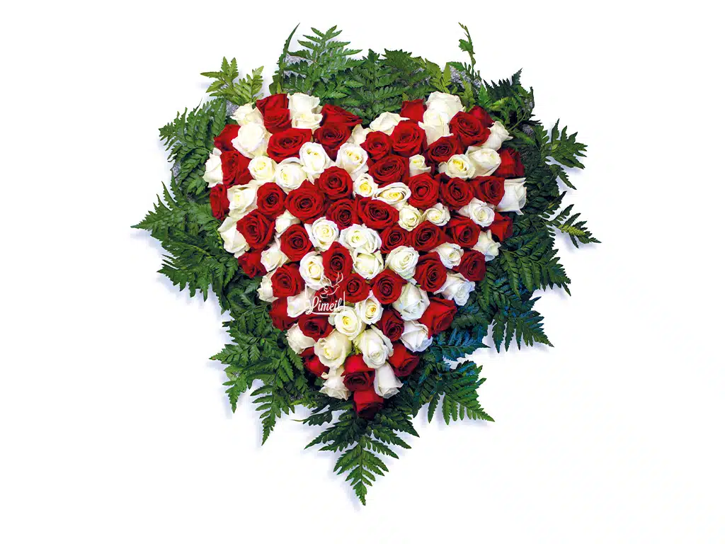 Les Pompes Funèbres LOIC vous proposent ce cœur composé de roses rouge et blanche en fleurs fraîche symbole de tendresse et sérénité pour accompagner un dernier hommage. Cette composition florale convient parfaitement pour les expositions du cercueil lors d’un recueillement au cours d’une cérémonie civile ou religieuse et se pose idéalement, après l’inhumation sur la sépulture. Largeur : 45cm