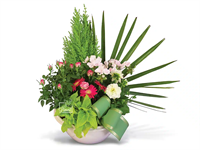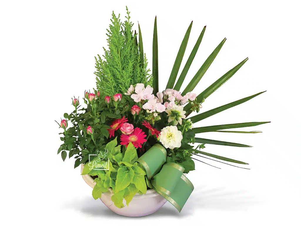 Les Pompes Funèbres LOIC vous proposent cette coupe de plantes, composition végétale durable et apaisante, idéale pour un hommage sobre et naturel. Réalisée à partir de plantes vertes et fleuries, cette coupe associe différents feuillages structurés et des touches florales délicates aux teintes roses, blanches et vertes. L’ensemble offre une présentation harmonieuse, symbole de paix, de continuité et de souvenir vivant. Cette coupe de plantes convient particulièrement pour un dépôt au funérarium, au cimetière ou sur une sépulture, et constitue un hommage respectueux qui s’inscrit dans le temps, en mémoire du défunt. Diamètre : 30 cm Photo non contractuelle. Les variétés et les coloris des plantes peuvent varier selon l’arrivage et la saison.