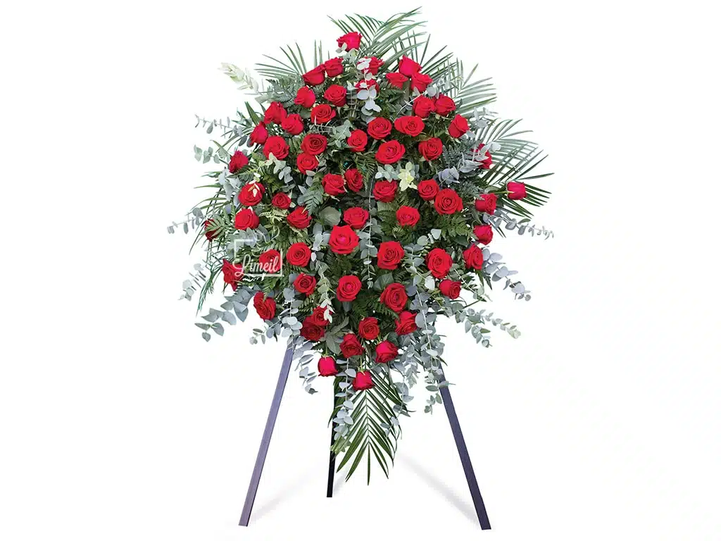 Les pompes funèbres LOIC, vous proposent cette couronne sur pieds en fleurs naturelles composé de : Rose rouge, Lentisque, Eucalyptus Cette composition florale convient parfaitement pour les expositions du cercueil lors d’un recueillement au cours d’une cérémonie civile ou religieuse. Livraison gratuite dans toute l’Ile de France, uniquement les départements 75-77-78-91-92-93-94-95 Aucune livraison hors ces départements actuellement.