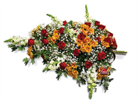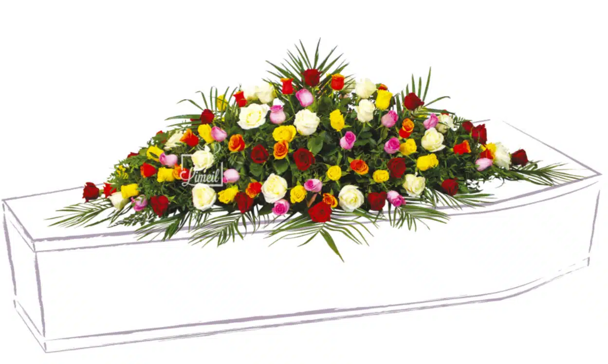 Ce dessus de cercueil vous est proposé par Les Pompes Funèbres LOIC, vous propose cette composition en fleurs naturelle, composé de plusieurs roses rouges, roses roses, roses jaunes, roses oranges, roses blanches et Lentisque. Cette composition florale convient parfaitement pour les expositions du cercueil lors d’un recueillement au cours d’une cérémonie civile ou religieuse et se pose idéalement, après l’inhumation sur la sépulture. Livraison gratuite dans toute l’Ile de France, uniquement les départements 75-77-78-91-92-93-94-95 Aucune livraison hors ces départements actuellement.