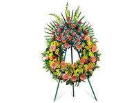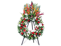 Les pompes funèbres LOIC, vous proposent cette couronne sur pieds composé de Cordyline rouge, Rose orange, Veronique bleu, Anthurium bordeaux, Hortensia vert, Lentisque, Cymbidium blanc 12 fleurons Cette composition florale convient parfaitement pour les expositions du cercueil lors d’un recueillement au cours d’une cérémonie civile ou religieuse. Merci de nous contacter avant de passer commande. L’exotique peut varier selon l’arrivage et la saison. Livraison gratuite dans toute l’Ile de France, uniquement les départements 75-77-78-91-92-93-94-95 Aucune livraison hors ces départements actuellement.
