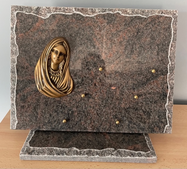 Plaque granit sur socle, motif Vierge - Dimensions 30 x 40 cm - 3 inters à choisir parmi notre sélection d’inters de plus de 100 textes. avec liens de parenté, d’amitié et de message de regret.