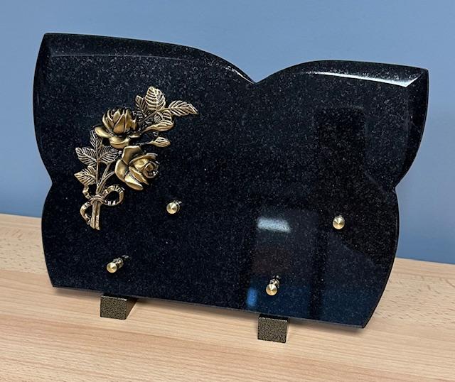 Plaque Granit sur pieds Bronze : 2 Roses Dimensions : 20 x 30 Forme - 2 inters à choisir parmi notre sélection d’inters de plus de 100 textes. avec liens de parenté, d’amitié et de message de regret.