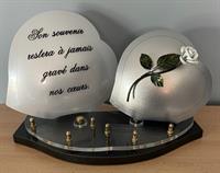 Plaque plexi sur socle 2 cœurs avec message et rose - Dimensions 25 x 43 cm - 3 inters à choisir parmi notre sélection d’inters de plus de 100 textes. avec liens de parenté, d’amitié et de message de regret.
