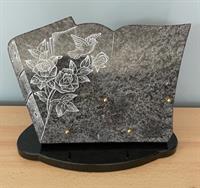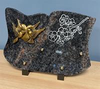 Plaque Granit sur pieds, motif fleur gravé et bronze coeur colombe Dimensions : 20 x 30 forme - 2 inters à choisir parmi notre sélection d’inters de plus de 100 textes. avec liens de parenté, d’amitié et de message de regret.