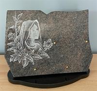 Plaque granit sur socle en forme découpée, motif sablé fleur et vierge - Dimensions 25 x 35 cm - 2 inters à choisir parmi notre sélection d’inters de plus de 100 textes. avec liens de parenté, d’amitié et de message de regret.