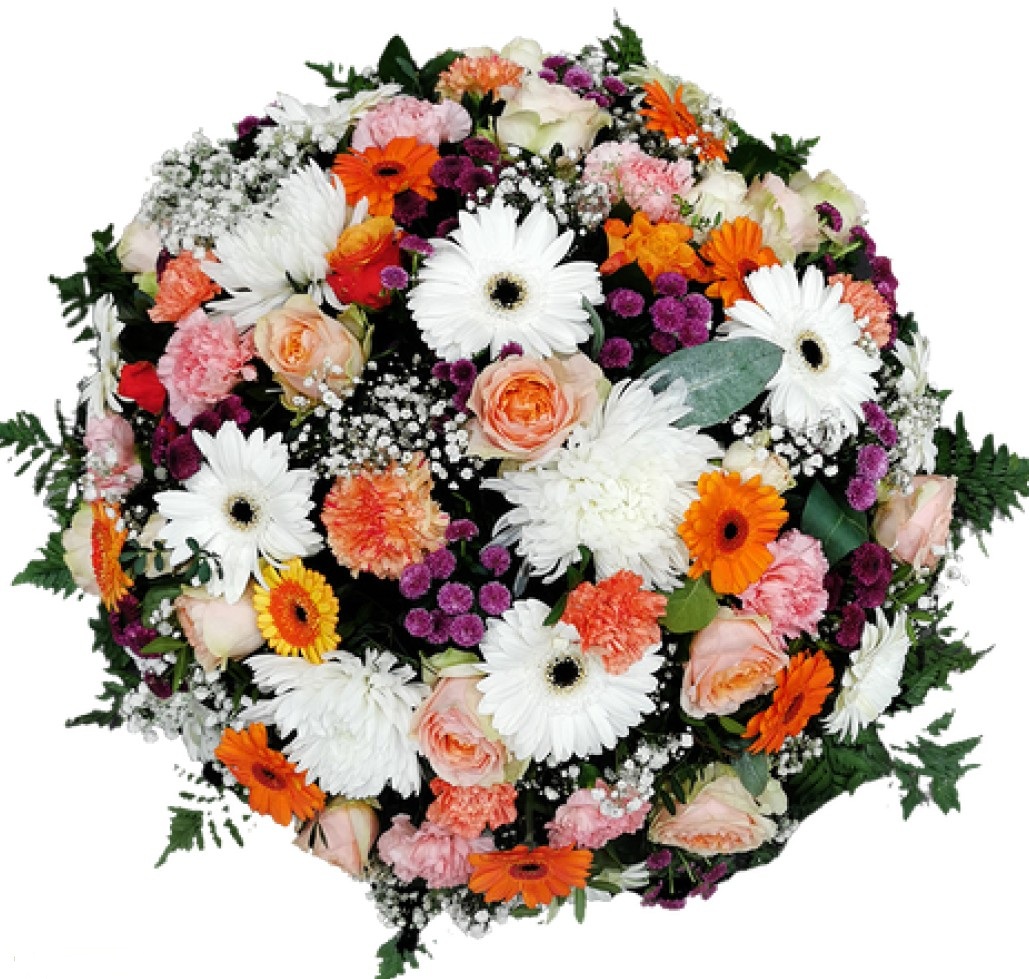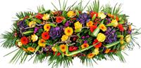 Photo non contractuelle | Desssus de cercueil coloré Eclatant dessus de cercueil avec fleurs de saison colorées - Env. 120 cm - Ruban inclus avec 50 caractères max -
