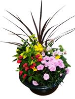Photo non contractuelle | Composition fleurie / Petit modèle Composition avec plantes et fleurs de saison, à base de 4 à 5 plantes vertes et fleuries - Diamètre env. 40 cm - Convient pour les cimetières